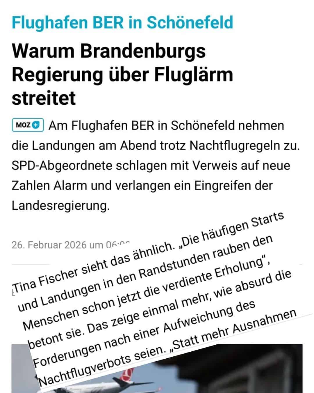 Einen Bericht dazu brachte die MOZ am 26.02.2026. Zu finden ist dieser unter folgendem Link: Flughafen BER in Schönefeld: Warum Brandenburgs Regierung über Fluglärm streitet | moz.de